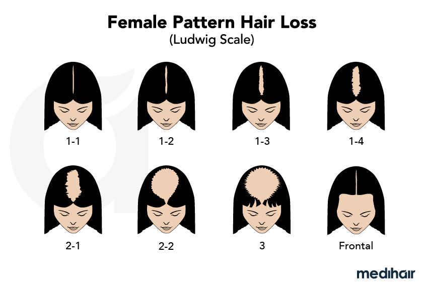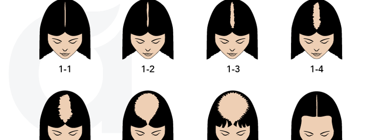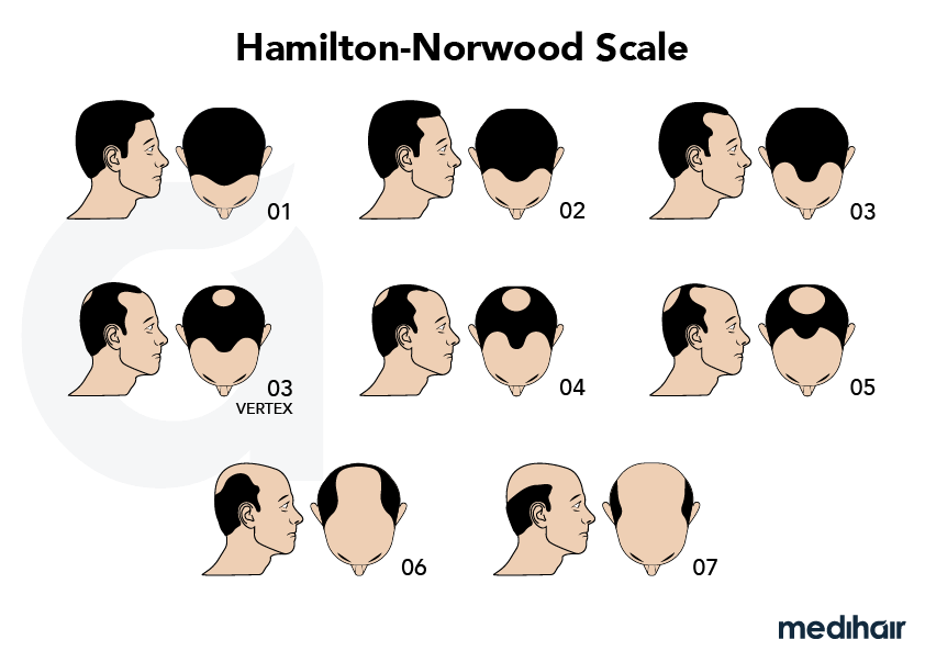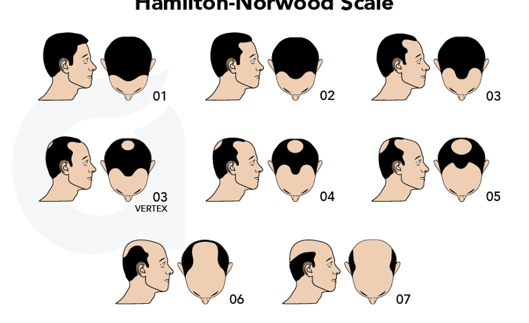 Figura 01. Padrão Hamilton-Norwood para homens de queda capilar e Ludwig para mulheres respectivamente. É a distribuição androgênica dos receptores capilares que explica o padrão de rarefação observado — na linha frontal e no vértex nos homens (padrão de Hamilton-Norwood) e na região central difusa nas mulheres (padrão de Ludwig).