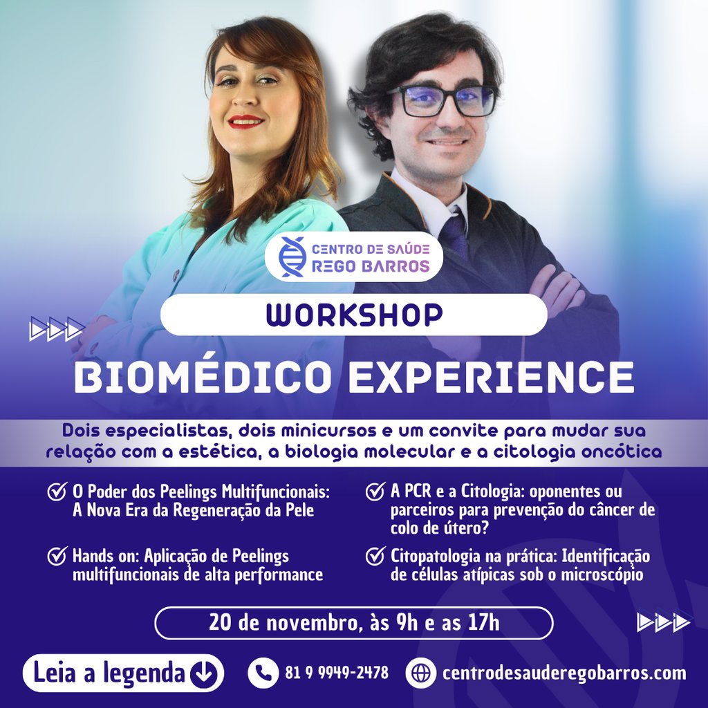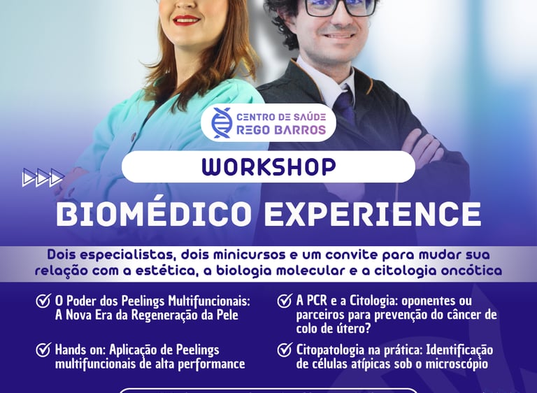 Biomédico(a)s, essa é sua chance de viver um dia completo de conhecimento, laboratório e atualização científica! Descubra o segredo científico por trás dos peelings e venha aprender sobre PCR e sua relação com a citopatologia! Ganhe o livro de PCR e eleve sua relação com a biomedicina, venha para o Biomédico Experience do CSRB Educa!
